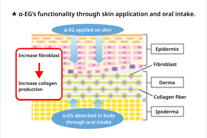 Collagen, which exerts a moisturizing effect within the dermis of the skin, is produced by fibroblasts in the dermal layer. It has been discovered that α-EG, even at an extremely low concentration of 0.00001%, has the function of increasing these fibroblasts and enhancing collagen production when applied topically or consumed.