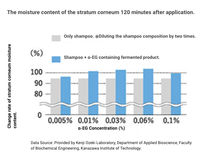 α-EG has long been recognized for its moisturizing effect when used long-term at a concentration of about 0.5% as found in sake. This recent study discovered that even at a low concentration of 0.01% and within a short duration of 15 to 120 minutes, α-EG possesses a quick-acting moisture retention function.